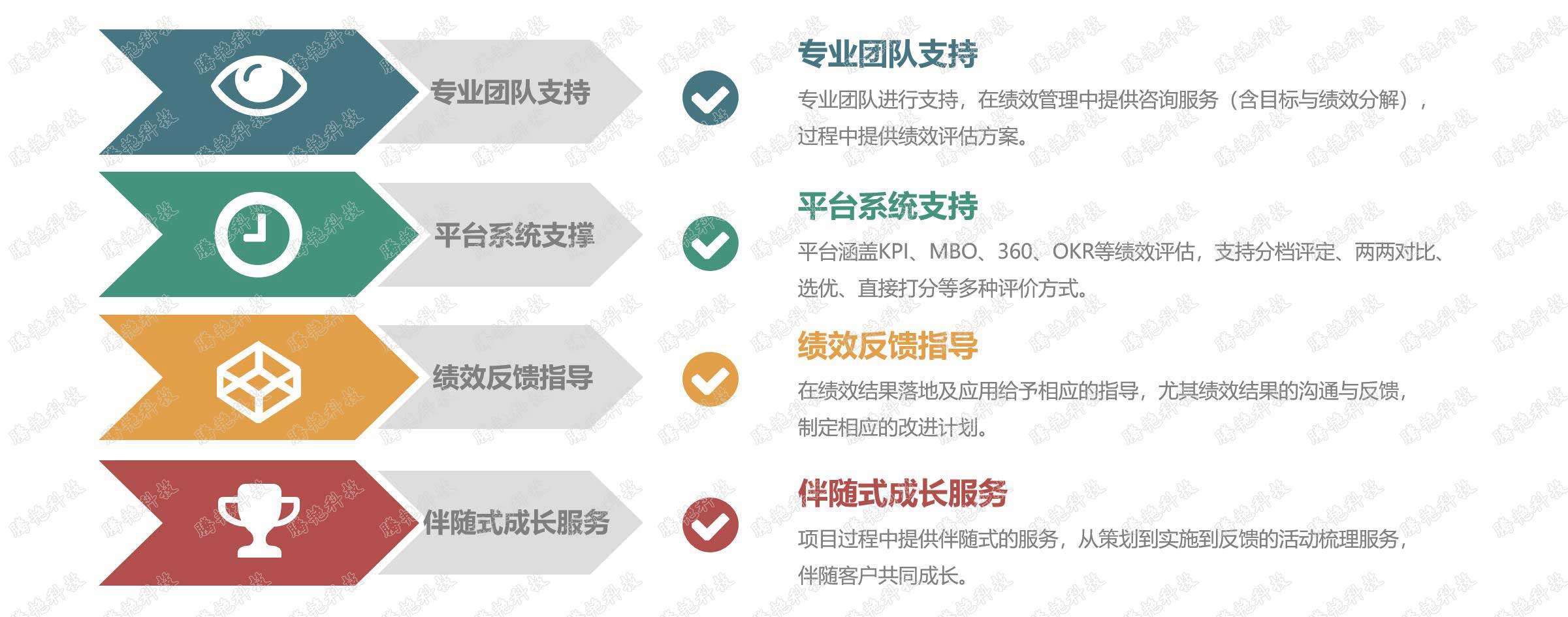 回归绩效管理本质,倡导敏捷绩效理念,帮助企业有效落地战略, 有效实现对员工的及时激励与客观评价,驱动企业与员工一体共赢。有效落实企业战略的执行力,将企业目标分解和落实到个人,设定具有挑战性的绩效目标,激励和管理员工,发现和改进管理短板,引导员工发展方向。
